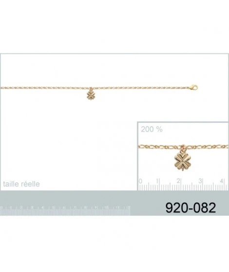 Chaîne de cheville plaquée or avec joli trèfle porte bonheur. Le trèfle est identique des 2 côtés et mesure 7 mm de côté. Longueur : 25 cm. Livrée dans sa jolie pochette organza.