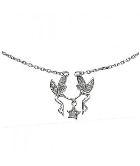 Collier en argent rhodié et oxydes de zirconium, 2 jolies fées portent une étoile. Longueur : 42 cm. Fermoir mousqueton. Largeur des 2 fées : 25 mm . Hauteur d’une fée : 18 mm. Livré dans sa jolie pochette.