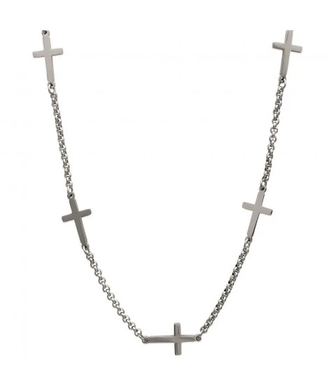 Collier en acier très solide, composé de chaine et de 5 croix. Fermoir mousqueton. Longueur : 45 cm. Livré dans sa jolie pochette.