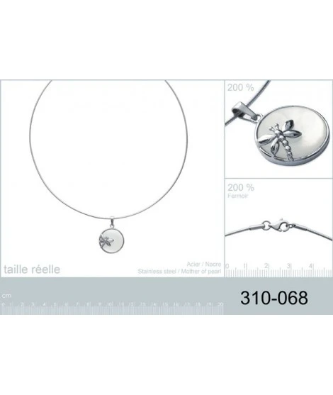Collier tour de cou en acier, avec pendentif rond de nacre blanche et jolie libellule posée dessus. Fermoir mousqueton. Diamètre du tour de cou fermé : 13,5 cm. Diamètre du pendentif : 23 mm.