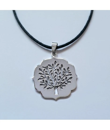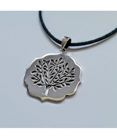 Superbe collier sur cordon de couleur au choix, avec magnifique pendentif en argent 925/000 avec motif « arbre de vie » ajourĂ© dans la mĂ©daille. Largeur : 26 mm. Hauteur totale : 34 mm. Poids d’argent : 4,4 grammes. LivrĂ© dans sa jolie pochette.