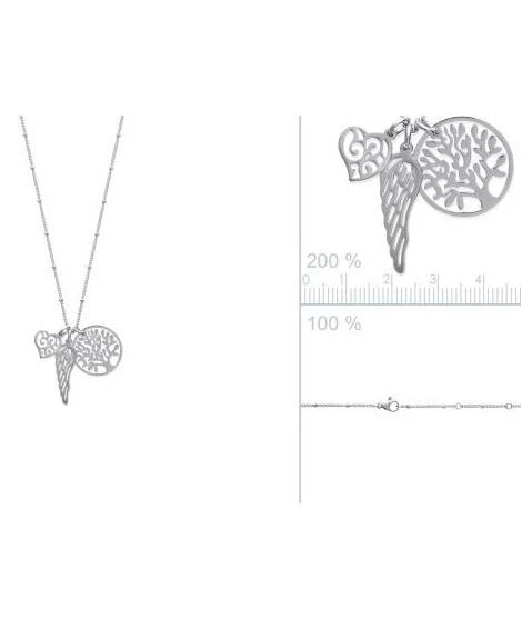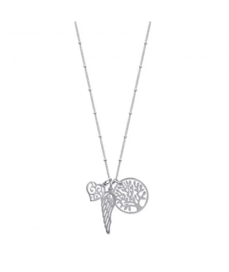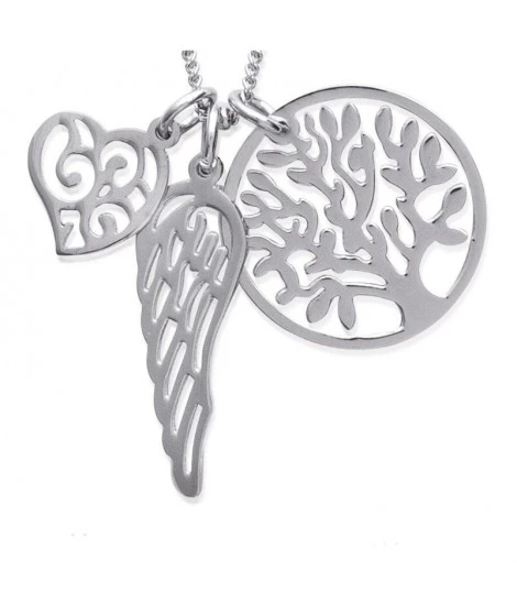 Collier en acier, avec 3 pendentifs : arbre de vie (diamètre : 22 mm) + aile d’ange + coeur stylisĂ©. Un collier plein d’amour ! Chaine avec perle tous les 16 mm, très originale et vraiment jolie. Fermoir mousqueton. LivrĂ© dans sa jolie pochette.