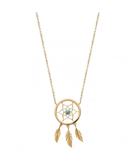 Collier plaqué or garanti 10 ans avec superbe « attrape-rêve », « capteur de rêve » ou « dreamcatcher », 3 plumes et petite pierre turquoise au centre. Fermoir mousqueton. Très belle finition.  Longueur : 45 cm. Diamètre : 20 mm. Livré dans sa jolie pochette.