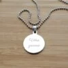 Collier en argent 925/000 sur chaĂ®ne avec chaĂ®nette de rĂ©glage dans la nuque. Barre 3 x 40 mm Ă graver. Gravure sur le recto comprise dans le prix. Poids d’argent : 2,7 grammes. Longueur rĂ©glable : 41 Ă 43,5 cm. LivrĂ© dans sa jolie pochette.