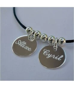 Collier sur cordon couleur au choix, avec 1, 2, 3, 4 ou 5 médailles à graver en argent 925/000. Gravures recto comprises dans le prix. Si vous choisissez 1 médaille, il y aura 1 perle en argent de chaque côté. Si vous choisissez 2 à 5 médailles, il y aura 3 perles entre chaque. Livré dans sa jolie pochette en organza prête à offrir.