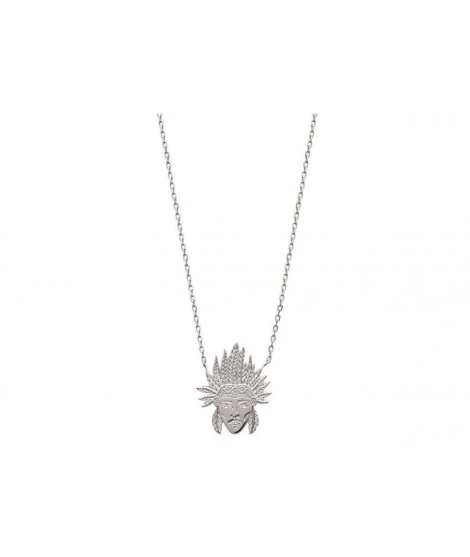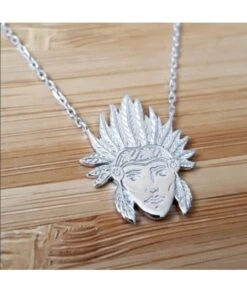 Collier en argent 925/000 massif, avec visage indien magnifique. Taille du pendentif : 17 x 21 mm. Poids d’argent : 3,70 grammes. Fermoir mousqueton. Anneau de rappel Ă 42 cm pour le porter plus près du cou. LivrĂ© dans sa jolie pochette.