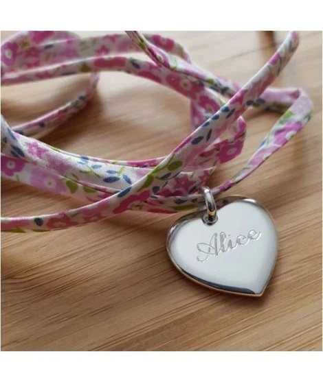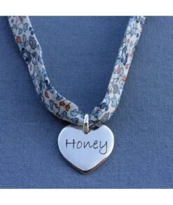Adorable collier sur ruban Liberty, accompagné de son joli pendentif coeur de 20 mm, en argent 925/000 ou plaqué or garanti 10 ans. Tout est compris dans ce petit prix : le cordon Liberty + le pendentif + la gravure sur le recto + la jolie pochette organza prête à offrir.