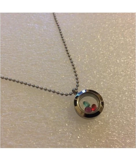 Pendentif en acier forme ronde (vendu vide). Diamètre : 20 mm. Epaisseur : 5 mm. ChaĂ®ne en acier maille boule + 2 pierres de naissance offertes ! Fermeture du pendentif par 2 aimants. Vous pourrez glisser Ă l’intĂ©rieur tout vos petits trĂ©sors prĂ©cieux (pierres de naissance, petits objets, mini messages, mèche de cheveux de bĂ©bĂ©…). LivrĂ© dans sa jolie pochette organza.