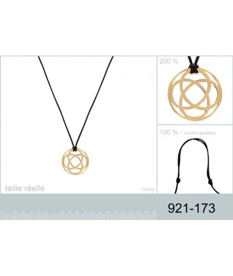 Collier sur cordon de couleur au choix, avec jolie rosace ou mandala en plaqué or garanti 10 ans. Diamètre : 35 mm. Collier ajustable par noeuds coulissants. Très joli sur un décolleté. Livré dans sa jolie pochette en organza prête à offrir.