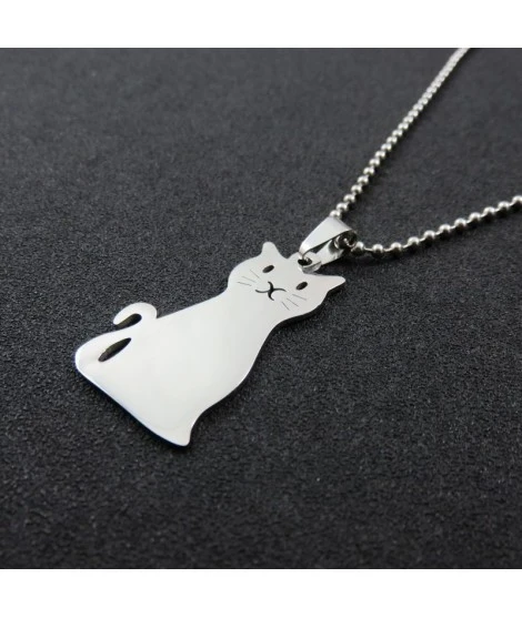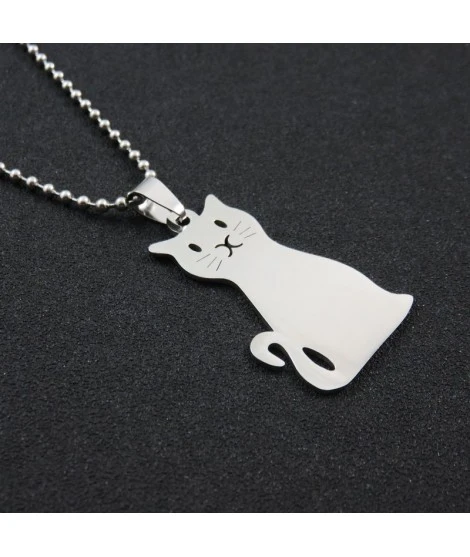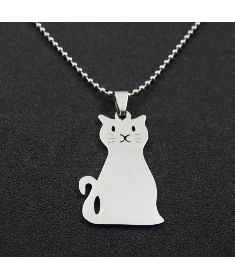 Collier en acier inoxydable avec joli pendentif en forme de chat. Le chat mesure 37 x 29 mm. Ses yeux et son museau sont percés, ce qui est très joli. Epaisseur : 2 mm. Chaîne boule de 50 cm avec fermoir. Gravure sur le recto comprise dans le prix. Livré dans sa jolie pochette.