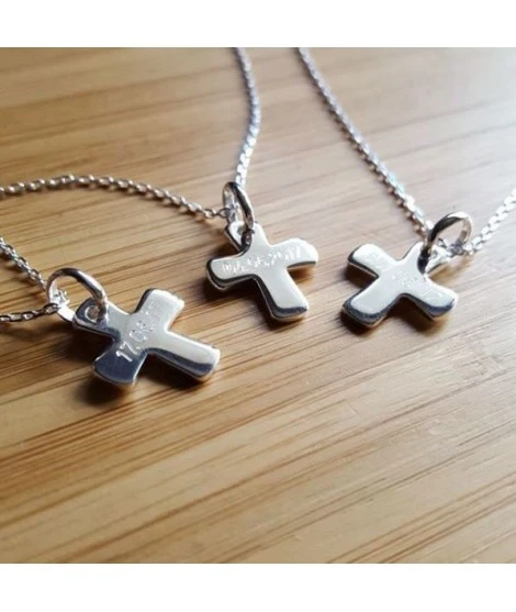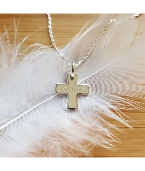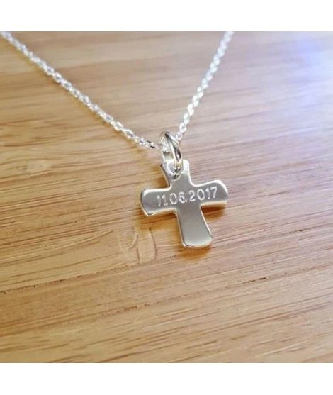 Ravissant collier en argent 925/000 composé d’une chaîne et d’une jolie petite croix à graver du texte de votre choix (1 seul prénom ou date par côté). Cadeau idéal pour un baptême ou une première communion. Livré dans sa jolie pochette.