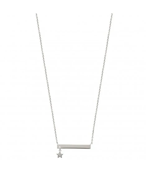Collier en argent rhodié avec plaque à graver et belle étoile brillante avec oxydes de zirconium. Longueur : 45 cm. Plaque : 28 x 4 mm. Poids d’argent : 2,64 grammes. Fermoir mousqueton. Gravure de votre choix sur le recto. Livré dans sa jolie pochette.