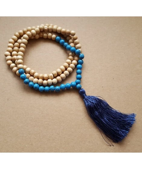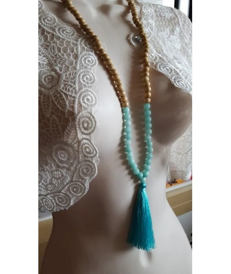 Collier sautoir composé de belles perles en bois et perles pierres gemme naturelle turquoise et grand pompon.