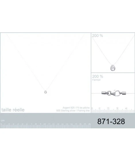Collier sur fil translucide transparent, style « fil de peche ». Pendentif goutte en argent 925/000 et oxyde de zirconium. Pendentif : 5 x 7 mm. Fermoir mousqueton en argent. Longueur : 42 cm. A porter sur un petit décolleté, à même la peau pour un effet qui ne laissera personne indifférent. Ma-gni-fi-que ! Livré dans sa jolie pochette en organza. Différents modèles disponibles.
