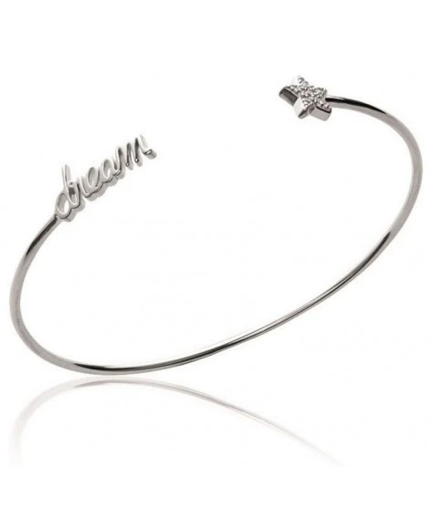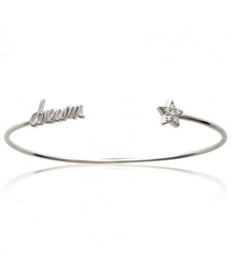 Demi jonc en argent rhodié, avec d’un côté le mot « dream » style manuscrit, et de l’autre côté une belle étoile décorée d’oxydes de zirconium bien brillants. Poids d’argent : 3,33 grammes. Dimensions : 56 x 49 mm. Livré dans sa jolie pochette. Très agréable à porter, avec ou sans autres bracelets.
