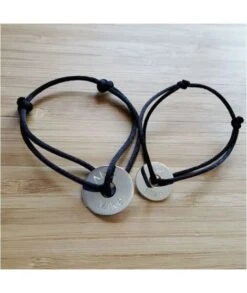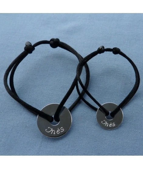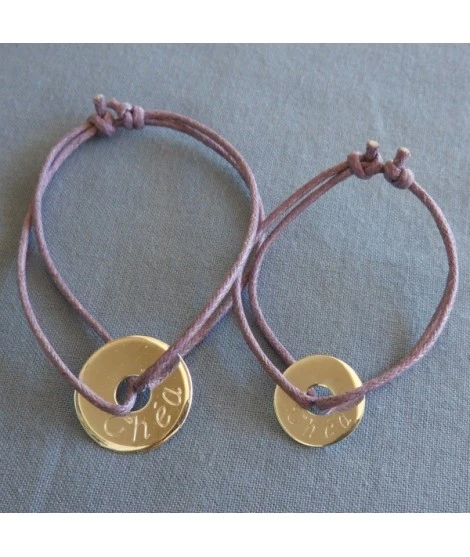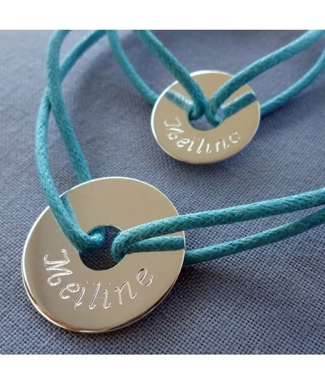 Un ravissant bracelet personnalisé gravé pour maman ou papa (disque 20 mm) assorti à celui de bébé (disque 15 mm). Disponible en argent 925/000 ou plaqué or garanti 10 ans. Couleur du cordon au choix, avec fermeture par noeuds coulissants. Gravures sur les rectos comprises dans le prix. Chaque bracelet est livré dans une ravissante pochette en organza.