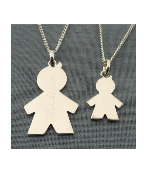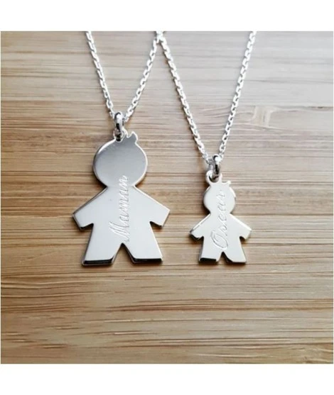 Un ravissant collier pour maman assorti à celui de bébé, version garçon. Disponible en argent 925/000 ou plaqué or garanti 10 ans. Hauteur grand personnage : 25 mm (hors bélière), petit personnage : 17 mm (hors bélière). Livré dans une jolie pochette en organza prête à offrir.
