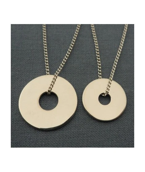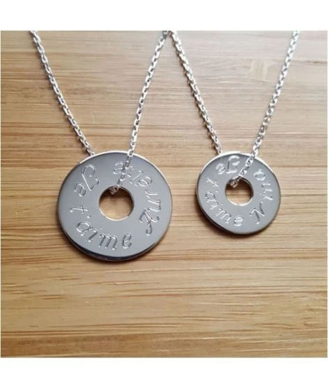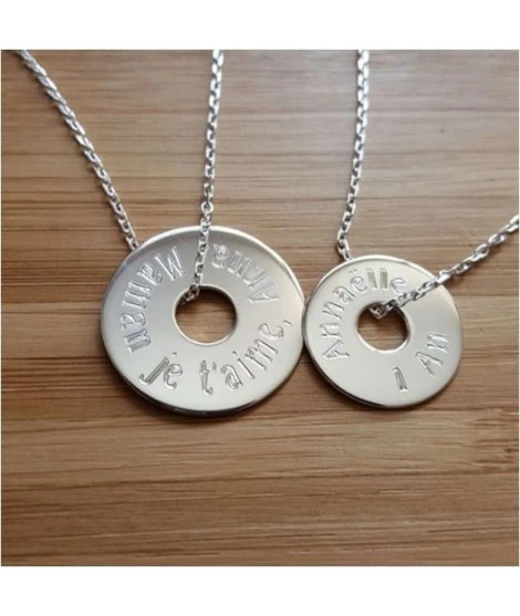 Un ravissant collier pour maman (disque 20 mm) assorti Ă celui de bĂ©bĂ© (disque 15 mm). Disponible en argent ou plaquĂ© or. N’oubliez pas de noter le prĂ©nom Ă graver sur le collier de la maman (45 cm) + sur celui de bĂ©bĂ© (40 cm), ci-dessous. Chaque collier est livrĂ© dans une pochette en organza prĂŞte Ă offrir.
