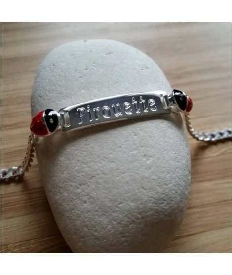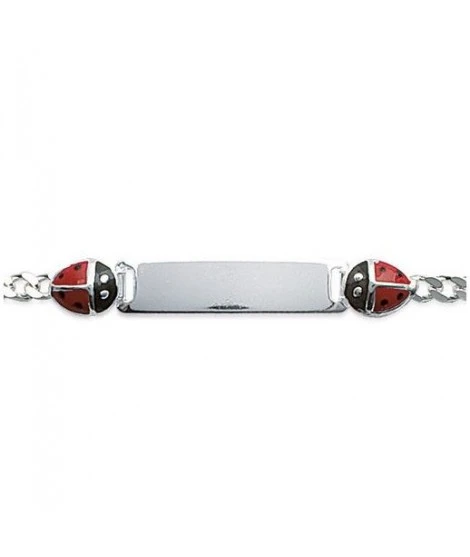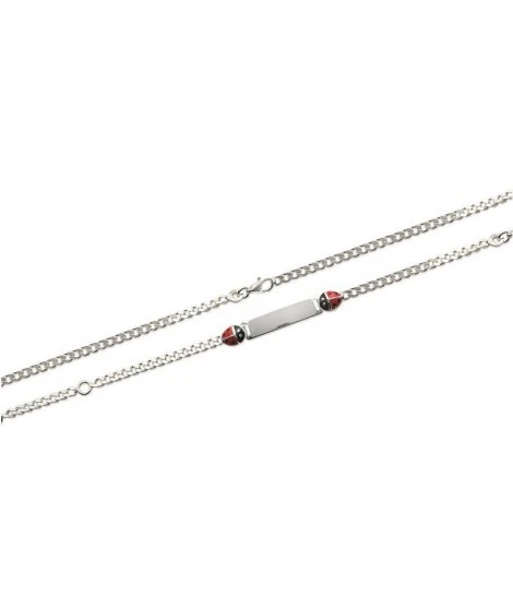 Adorable gourmette en argent 925/000 avec plaque Ă graver et 2 coccinelles, une Ă gauche et une Ă droite. Email de couleur rouge et noir. Un joli cadeau de naissance ou de baptĂŞme. Fermoir mousqueton. Gravure comprise dans le prix. Longueur : 16 cm. Poids d’argent : 3,90 grammes. LivrĂ©e dans sa jolie pochette en organza.