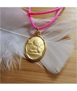 Pendentif de forme ovale avec ange en relief, très belle finition. Plaqué or garanti 10 ans. Dimensions : 14 x 19 mm hors bélière. Idée de cadeau de naissance, médaille de baptême, ou communion. A compléter si vous le souhaitez par 1 cordon, 1 chaîne et/ou 1 gravure. Livré dans sa jolie pochette en organza.
