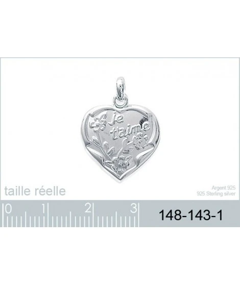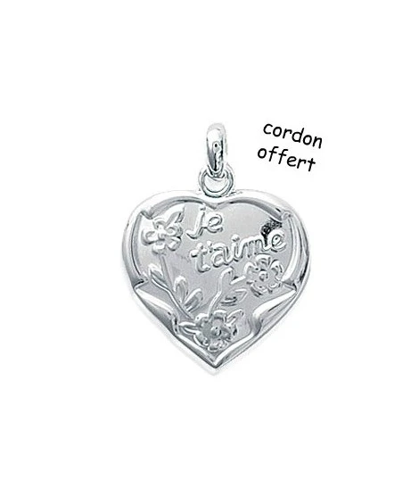 Pendentif en forme de coeur en relief avec l’inscription « Je t’aime » et des fleurs