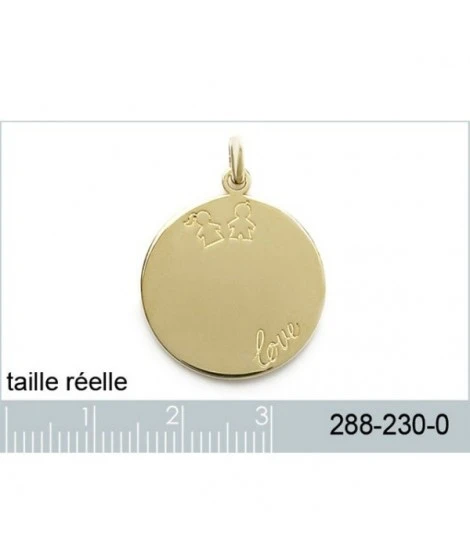 Jolie mĂ©daille ronde de 22 mm de diamètre avec l’inscription Love en bas Ă droite en arc-de-cercle et un garçon et une fille dessinĂ©s en haut au milieu.