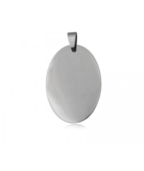 Pendentif en acier, forme ovale. L’ovale mesure 28 x 40 mm. Hauteur totale avec la bĂ©lière : 46 mm. A complĂ©ter si vous le souhaitez par 1 cordon, 1 chaĂ®ne et/ou 1 gravure. LivrĂ© dans sa jolie pochette en organza.