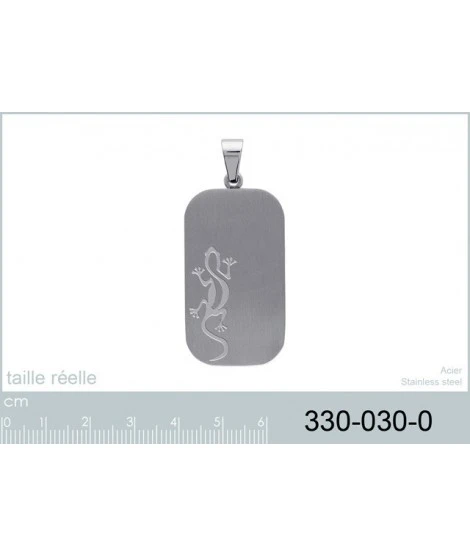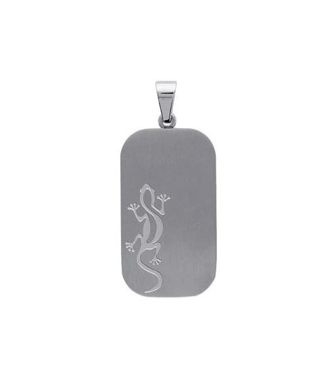 Pendentif rectangle arrondi, style plaque militaire, avec lézard, en acier. Dimensions : 22 x 39 mm. A compléter si vous le souhaitez par 1 cordon, 1 chaîne et/ou 1 gravure. Livré dans sa jolie pochette en organza.?