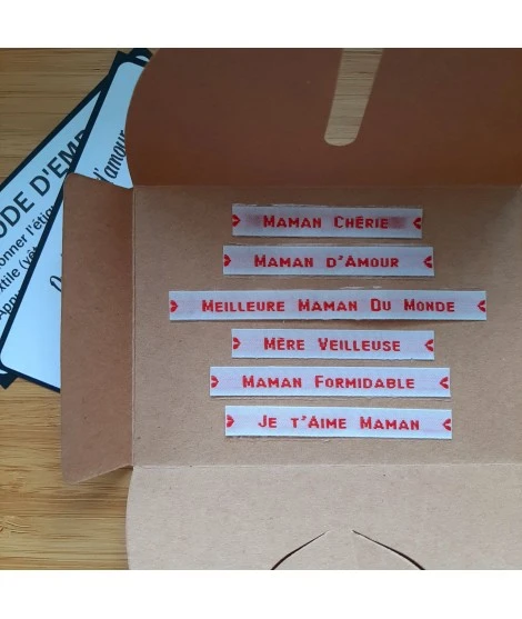 Craquez pour cette adorable pochette à offrir à votre maman. Elle contient beaucoup d’émotion, et notamment 6 belles étiquettes en tissu tissé avec 6 textes différents. Vous pourrez coudre ou thermocoller ces jolis messages d’amour sur par exemple un vêtement, dans un sac, une trousse de maquillage ou de stylos… bref, vous pourrez ainsi montrer à votre maman combien vous l’aimez et être toujours présent pour elle.
