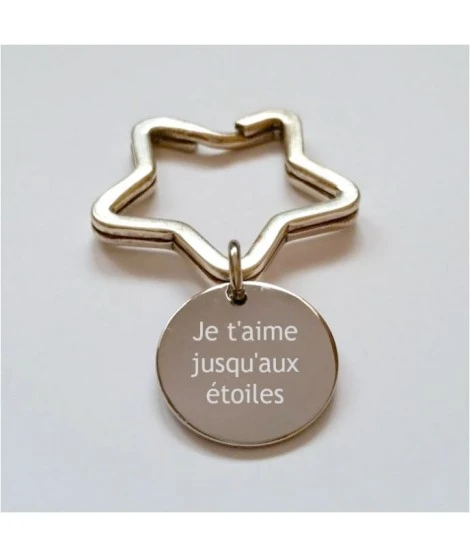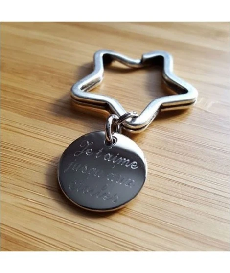 Porte-clé en acier composé d’un anneau en forme d’étoile, et d’une jolie médaille en acier légèrement bombée à graver. Gravure au choix sur le recto comprise dans le prix. Diamètre de la médaille : 20 mm. Etoile : 33 mm. Livré dans sa jolie pochette.