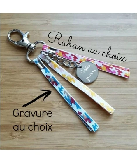 Porte clé gai et coloré. Médaille ronde en acier 20 mm, avec votre gravure sur le recto comprise dans le prix. 3 rubans top qualité, fabrication stéphanoise, 100% française. Ce porte-clé deviendra vite votre gri-gri porte bonheur. A accrocher à vos clés, votre sac, votre valise…