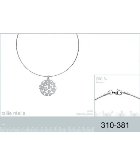 Tour de cou en acier, avec superbe arabesque ajourée. Diamètre du pendentif : 36 mm. Diamètre du tour de cou : 13,5 cm. Fermoir mousqueton.